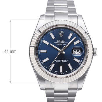 Swisstime. sr Datejust Swiss watches look feel and have the exact same dimensions as the original using incredible precision down to a nanometer! So the weight is exactly the same with the original and all watch parts inside/out are interchangeable with a genuine part. Datejust II & 41=41mm, Datejust=36mm