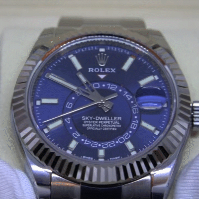 Silver-tone 18kt white gold and stainless steel Rx oyster case with a silver-tone 18kt white gold and stainless steel Rx oyster bracelet. Fluted bezel. Blue dial with silver-tone hands and index hour markers. Dial Type: Analog. Luminescent hands and markers. Date display at the 3 o'clock position. One- 24 hours subdials. Rx Calibre 9001 automatic movement with a 72-hour power reserve. Scratch resistant sapphire crystal. Screw down crown. Skeleton transparent exhibition see through case back. Case size: 42 mm. Round case shape. Water resistant at 100 meters / 330 feet. Functions: date, hour, minute, second. Luxury watch style. Watch label: Swiss Made.